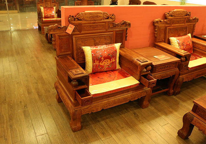 該款沙發(fā)所用材質(zhì)亦是福林堂紅木使用最多的大果紫檀,也叫緬甸花梨,屬花梨木類。緬甸花梨的木紋清晰,結(jié)構(gòu)細(xì)而勻,有些部位有明顯的虎皮紋,斷斷續(xù)續(xù)很是美觀;顏色偏紅色,其木紋為淡紅色,整體看上去有點(diǎn)肉色;緬甸花梨自身帶有一種特別的檀香味,其香悠遠(yuǎn)醇厚,不張揚(yáng);其材質(zhì)硬重,密度高。