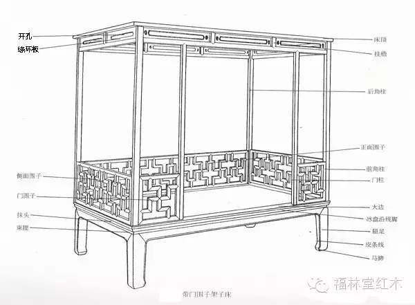 架子床是明清時期非常有代表性的一種臥具,其造型通常是四角有立柱,床面的兩側和后面裝有側欄,圍欄上面有各種裝飾元素,床頂有蓋,頂蓋四周裝有楣板和倒掛牙子,也有的架子床為了便于在床兩側安裝方形欄板——門圍子,就在床的正面多加兩根立柱,正中無圍處則是上床的門戶。還有一些架子床雕刻精致,在中間留出橢圓形的月洞門,非常美觀。